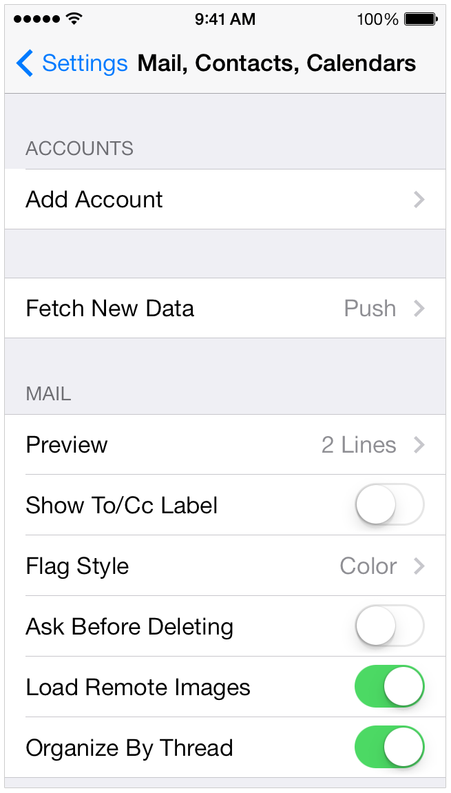 2. Scroll down and tap Mail, Contacts, Calendar.